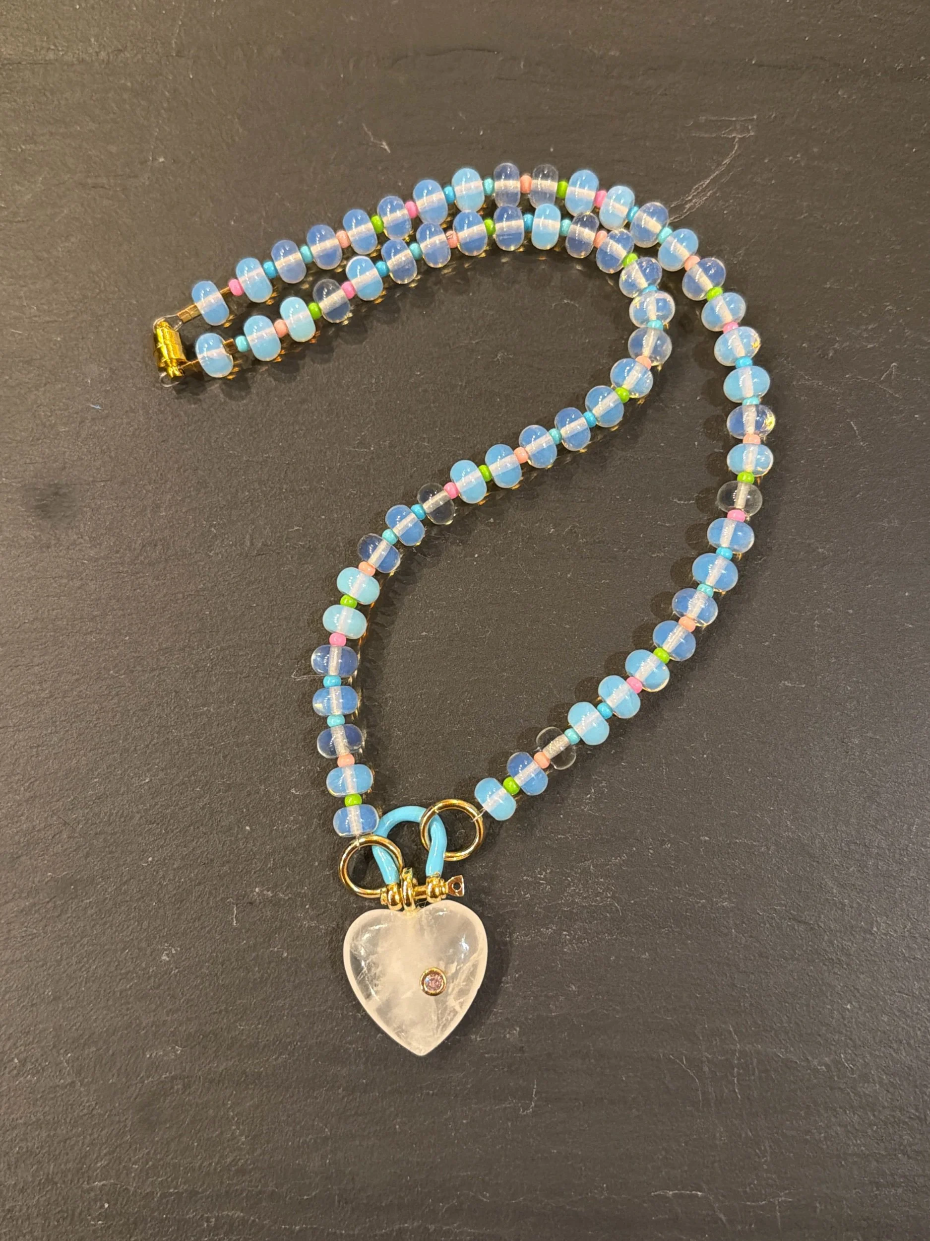 Opalite rondelle gemstones with blue, pink and green glass accent beads finished with a light blue horseshoe and quartz heart pendant. 20” strand length.