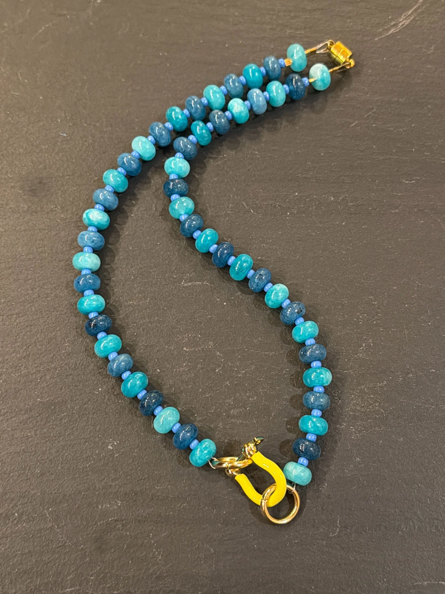 Apatite, Kyanite and Amazonite gemstones with blue glass accent beads finished with a neon yellow and gold horseshoe. 16” strand length.
