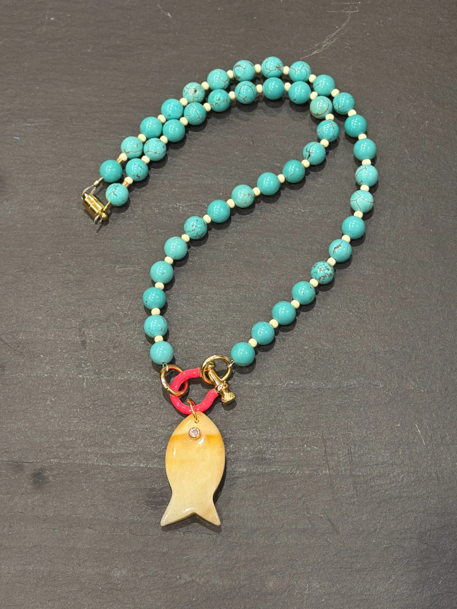 Turquoise gemstones with cream glass accent beads with a neon pink and gold horseshoe with a Yellow Jasper fish pendant. 21” strand length.