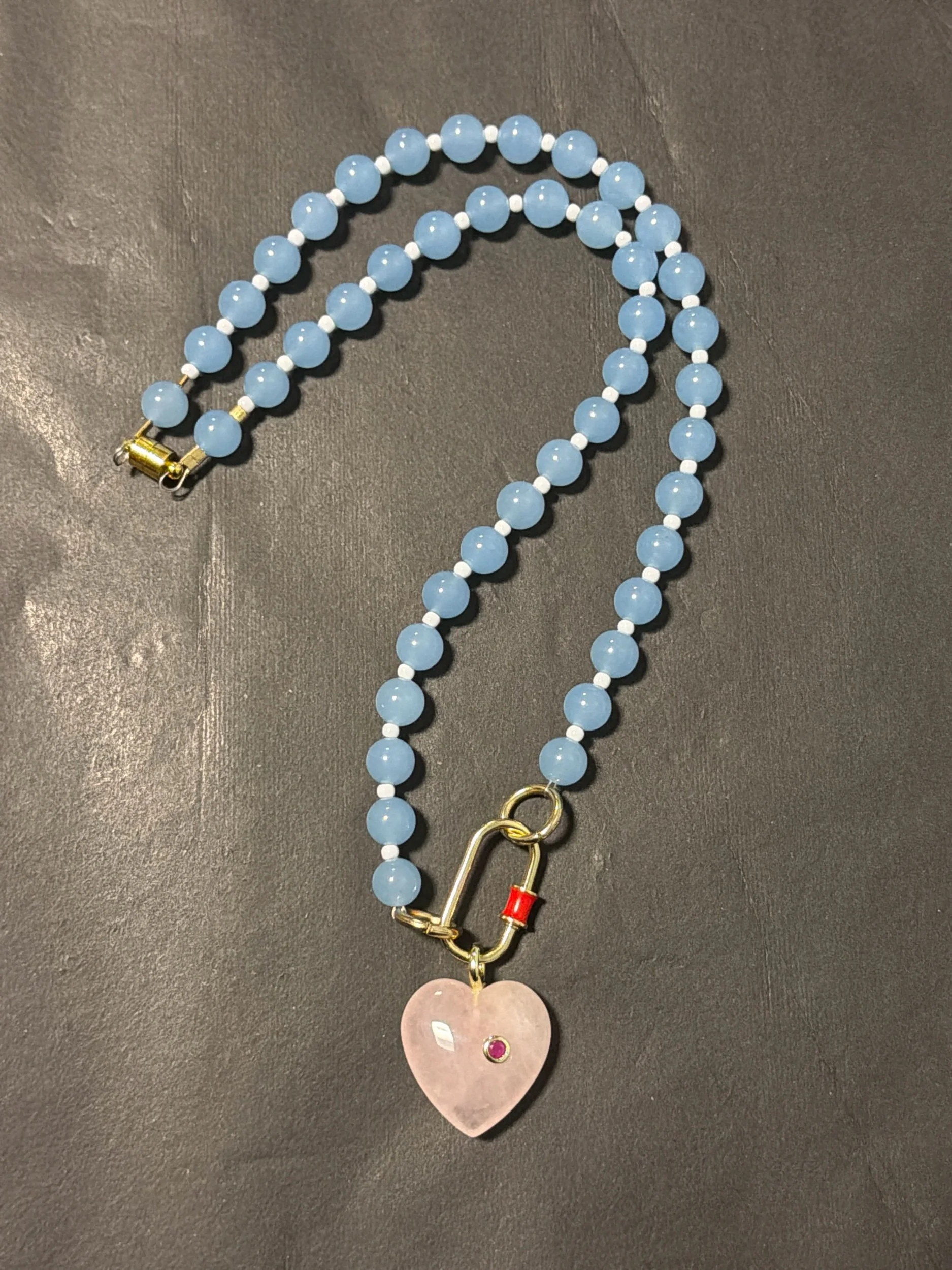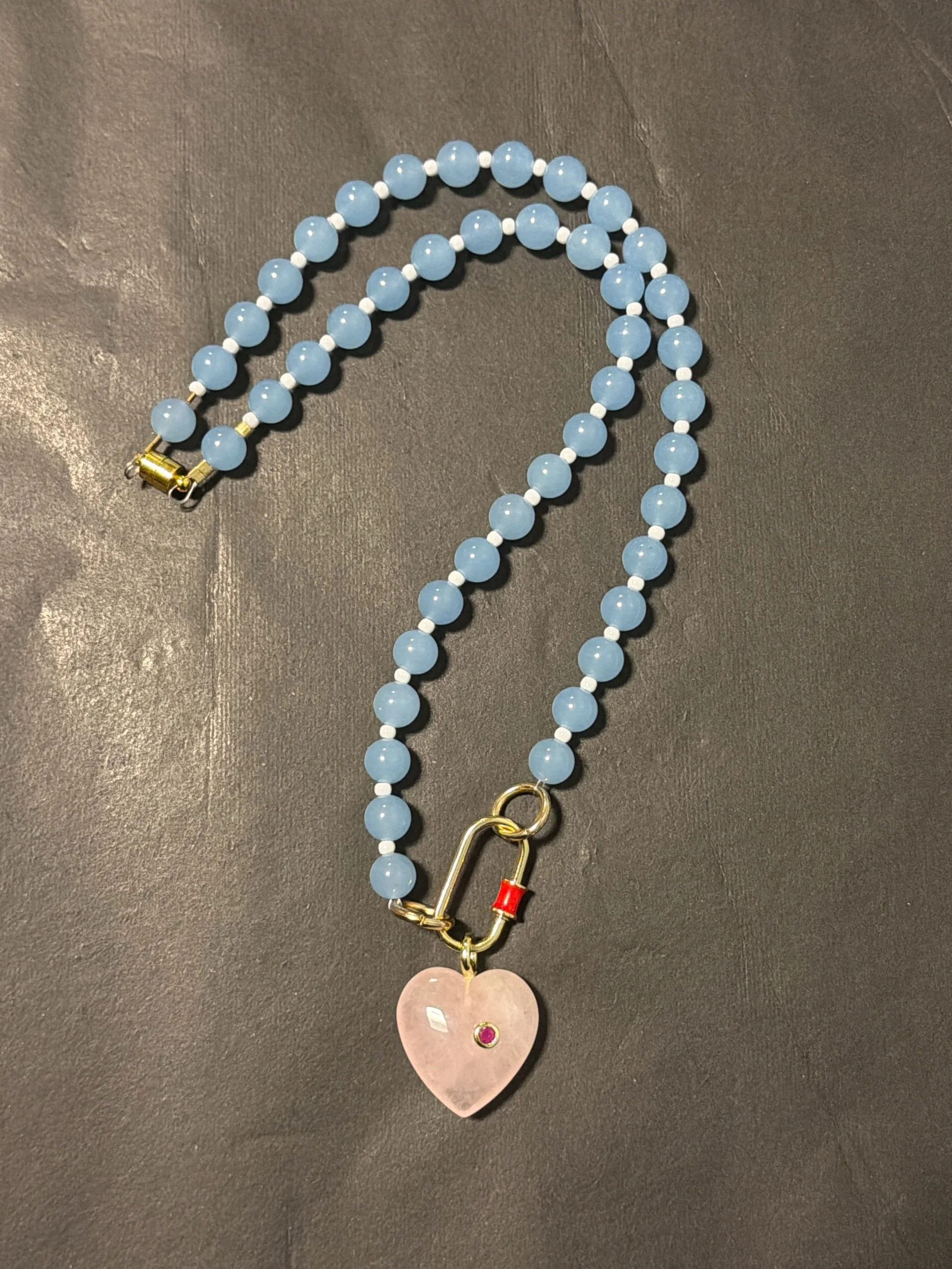 Blue Lace Agate gemstones with cream glass accent beads finished with a red and gold paperclip and Rose Quartz heart pendant. 21” strand length.