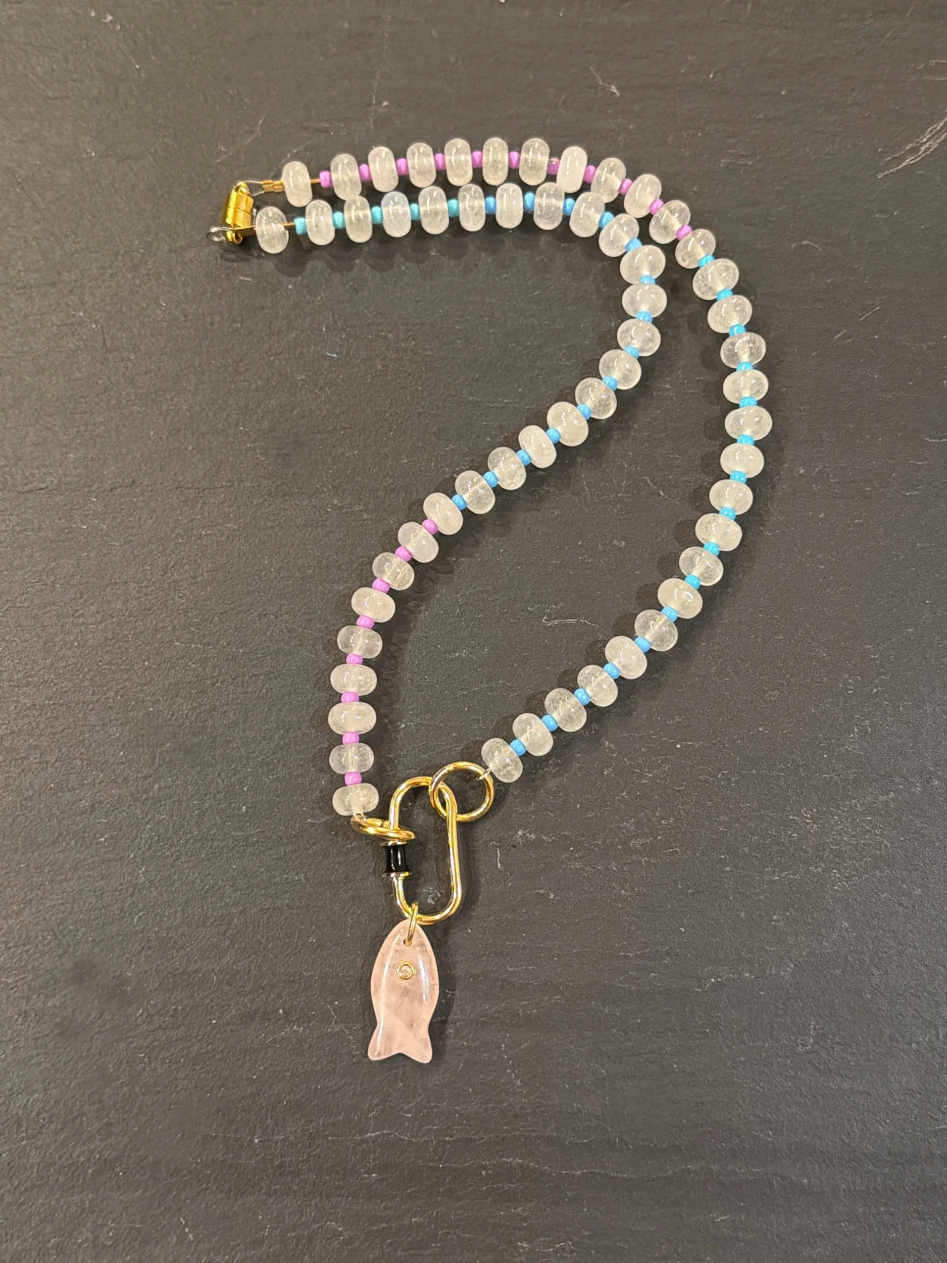 Clear Agate rondelle gemstones with blue and purple glass accent beads finished with a black and gold paperclip and small rose quartz fish pendant. 18” strand length.