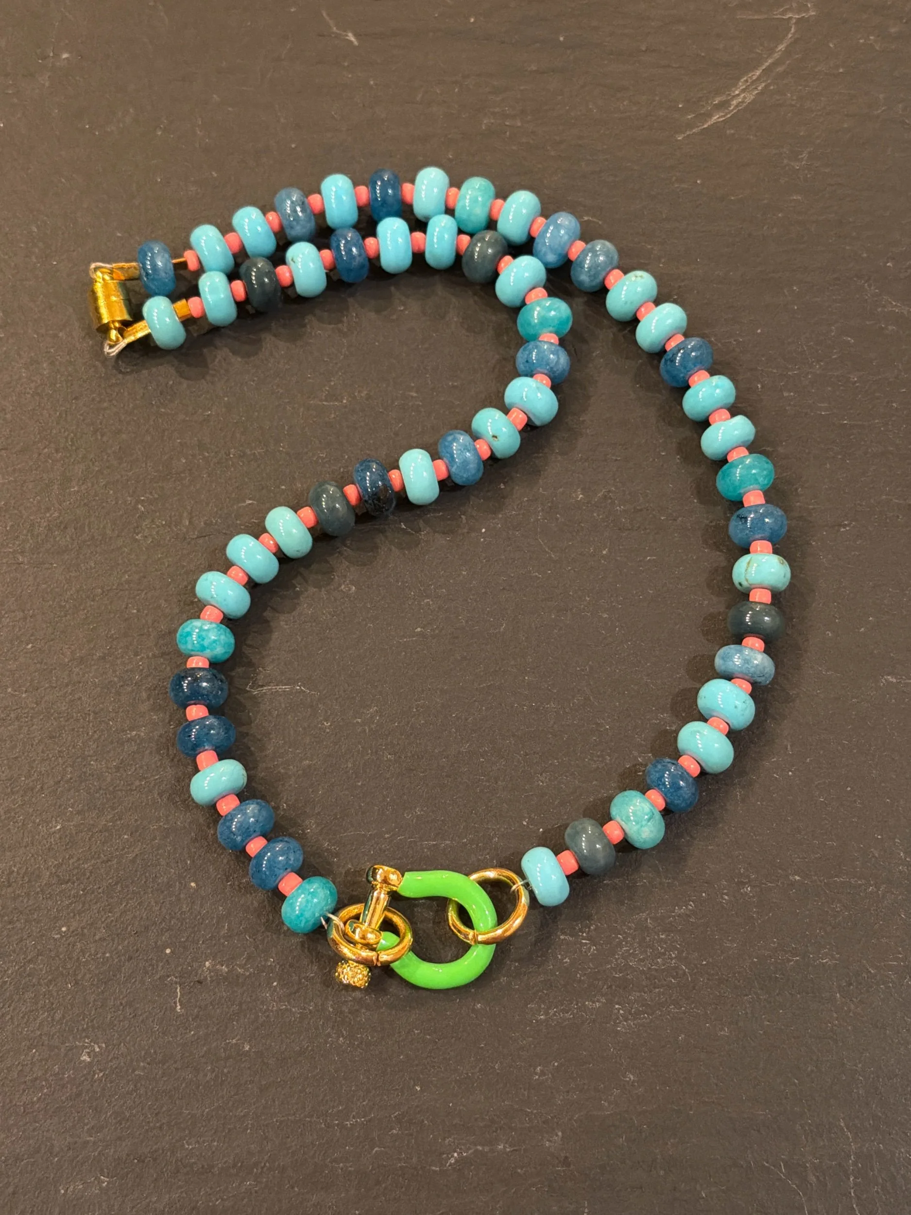 Apatite, Turquoise, and Blue Kyanite rondelle gemstones with pink glass accent beads finished with a neon green and gold horseshoe. 16” strand length.