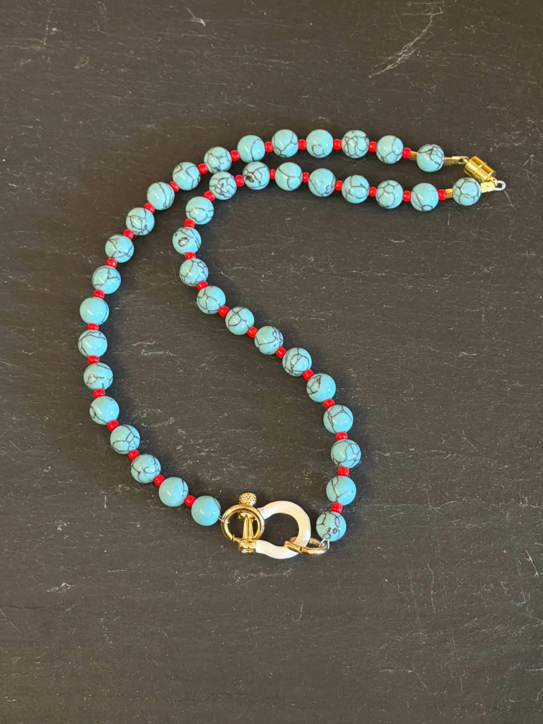 Turquoise gemstones with red glass accent beads finished with a white and gold horseshoe. 18” strand length.
