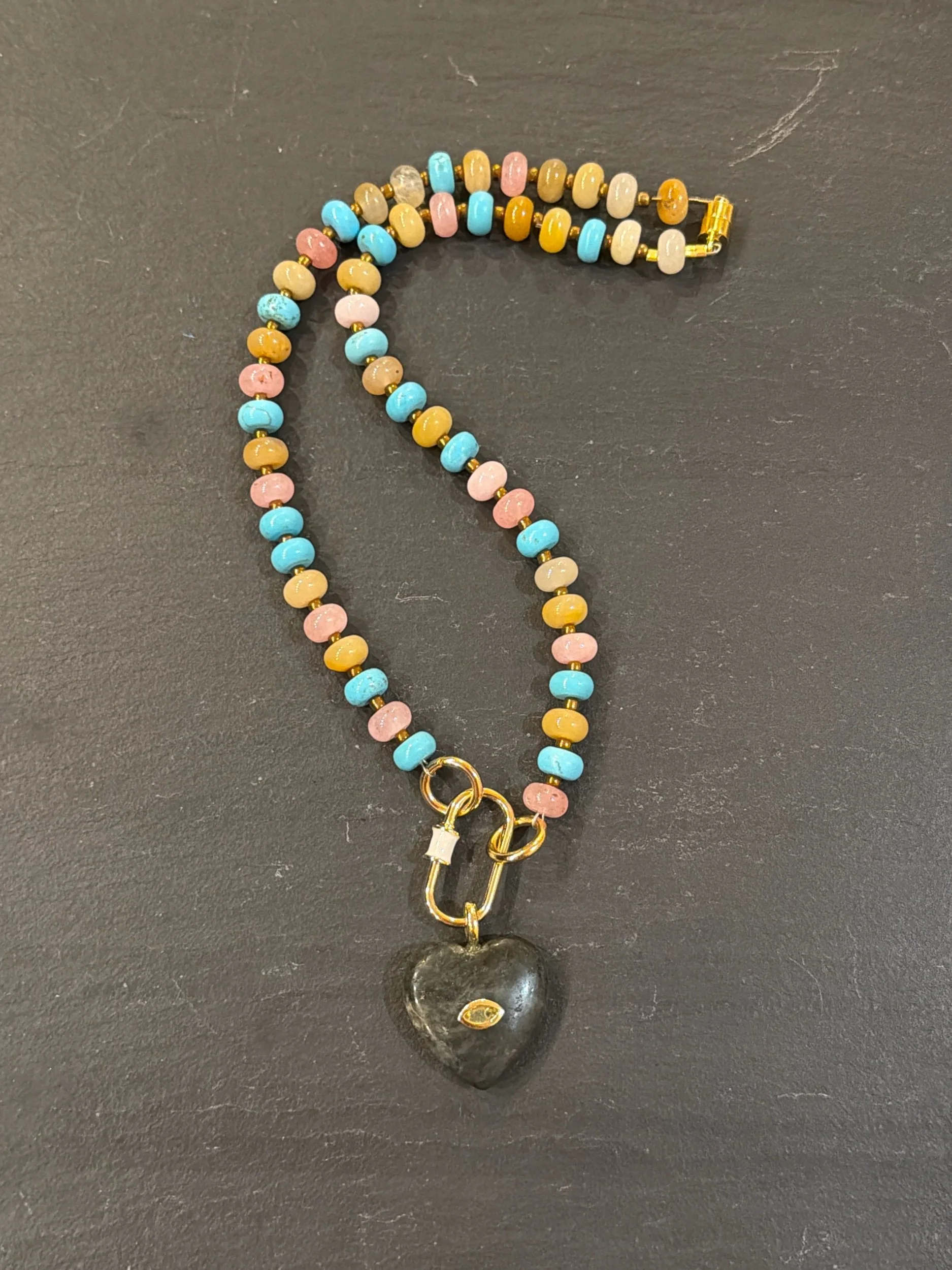Turquoise, Honey Jade, Pink Opal, and Golden Agate rondelle gemstones finished with a white and gold paperclip and Lapis Lazuli heart pendant. 17” strand length.