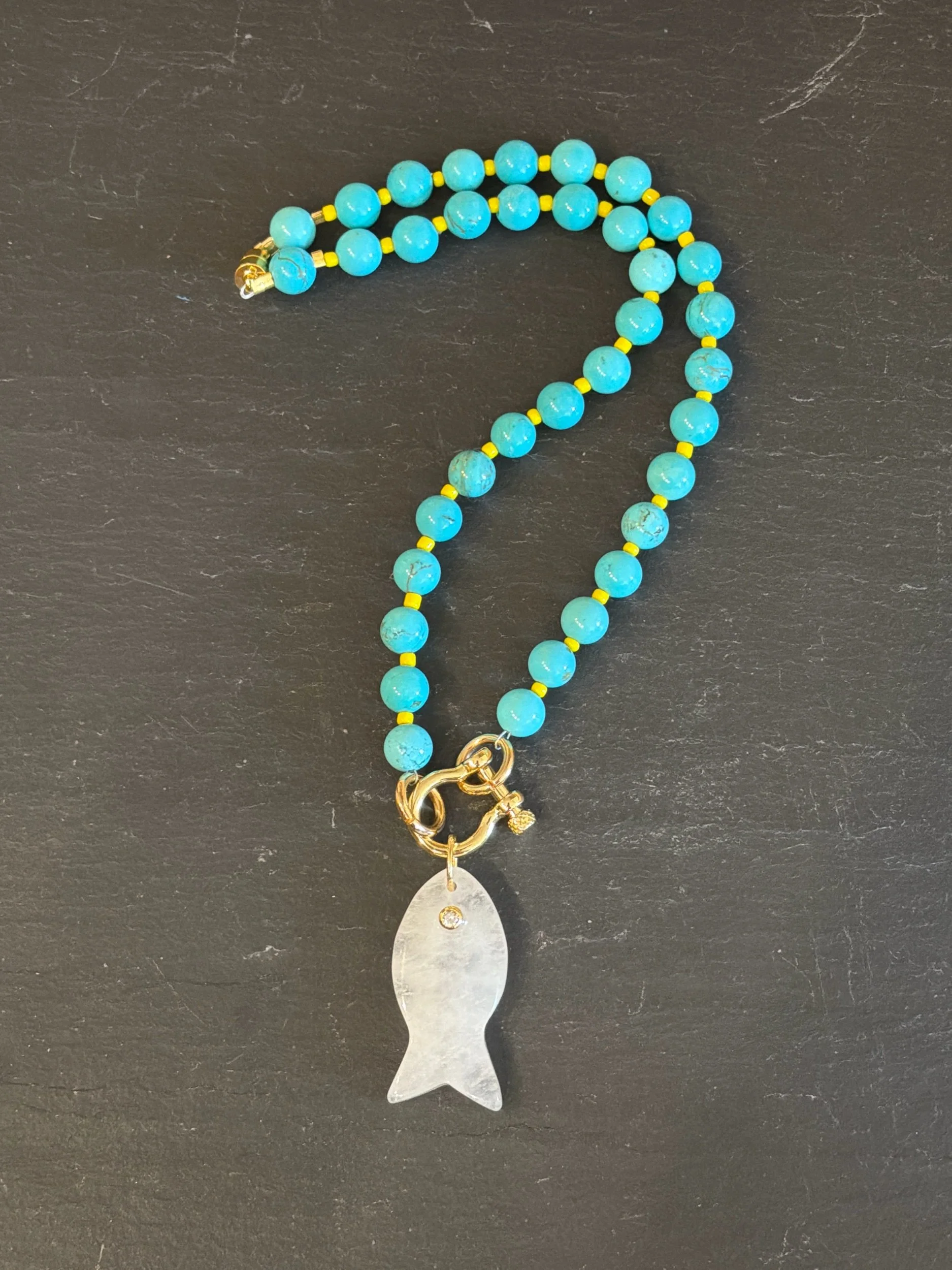 Turquoise gemstones with yellow glass accent beads finished with a gold horseshoe and Clear Quartz fish pendant. 17” strand length.