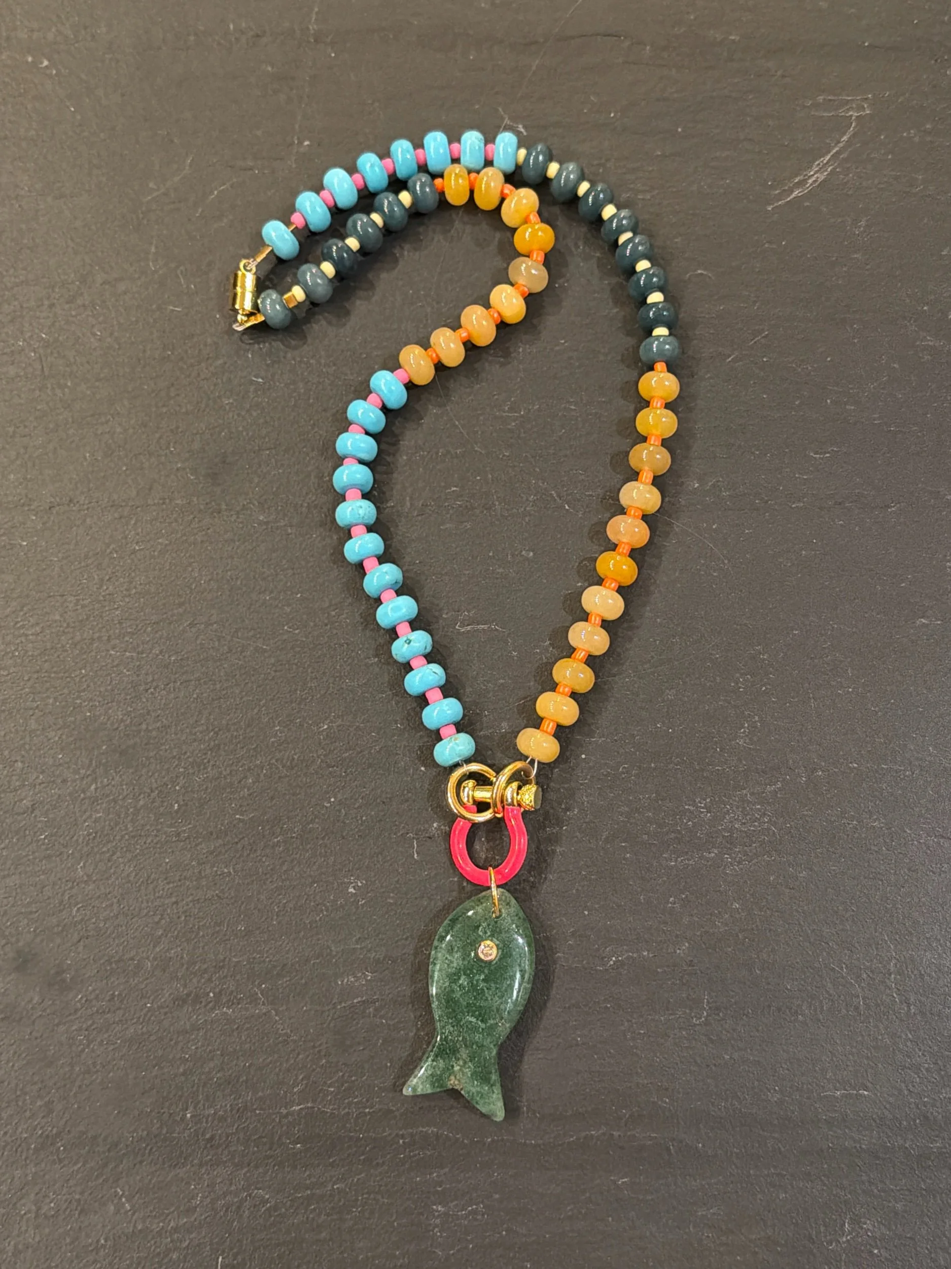 Turquoise, Honey Jade, and Hematite rondelle gemstones with pink, orange and cream glass accent beads finished with a neon pink and gold horseshoe and Aventurine fish pendant. 18” strand length.