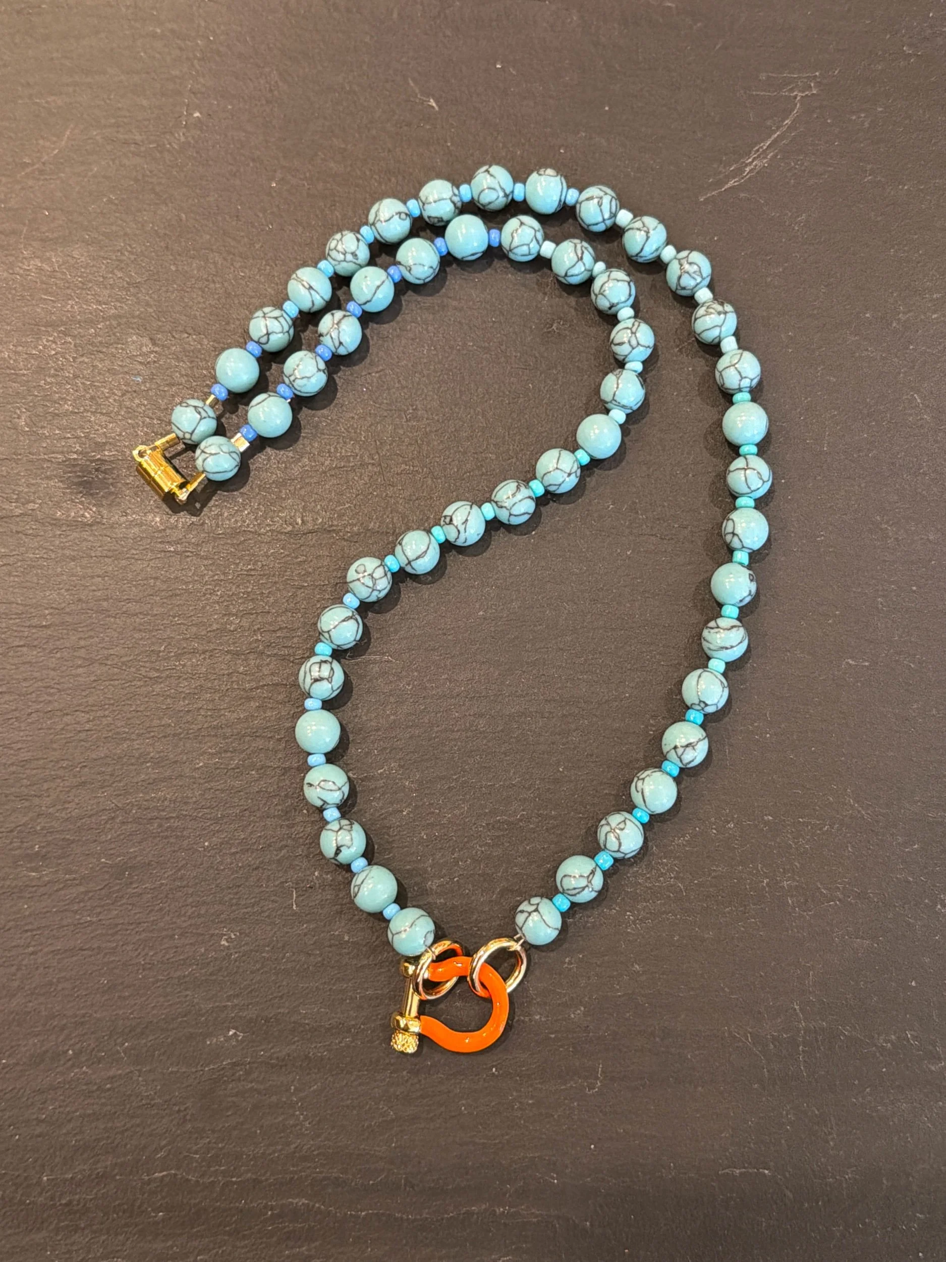 Turquoise gemstones with an ombre of blue glass accent beads finished with a neon orange and gold horseshoe. 22” strand length.
