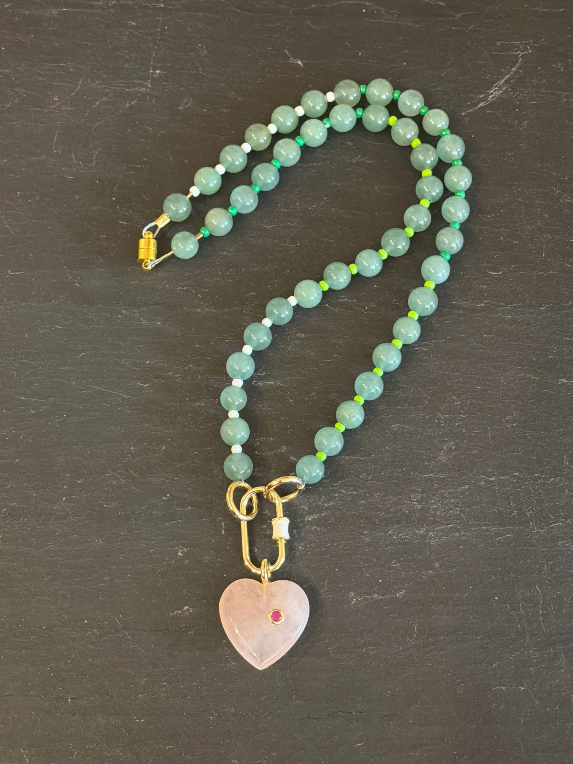 Aventurine gemstones with green ombre glass accent beads finished with a white and gold paperclip and Rose Quartz heart pendant. 20” strand length.