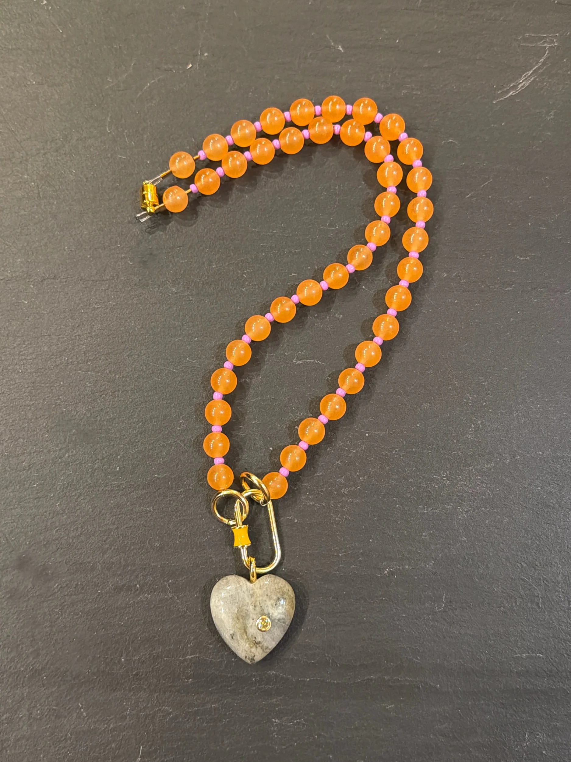 Orange Jade gemstones with purple glass accent beads finished with a yellow and gold paperclip and Labradorite heart pendant. 19” strand length.