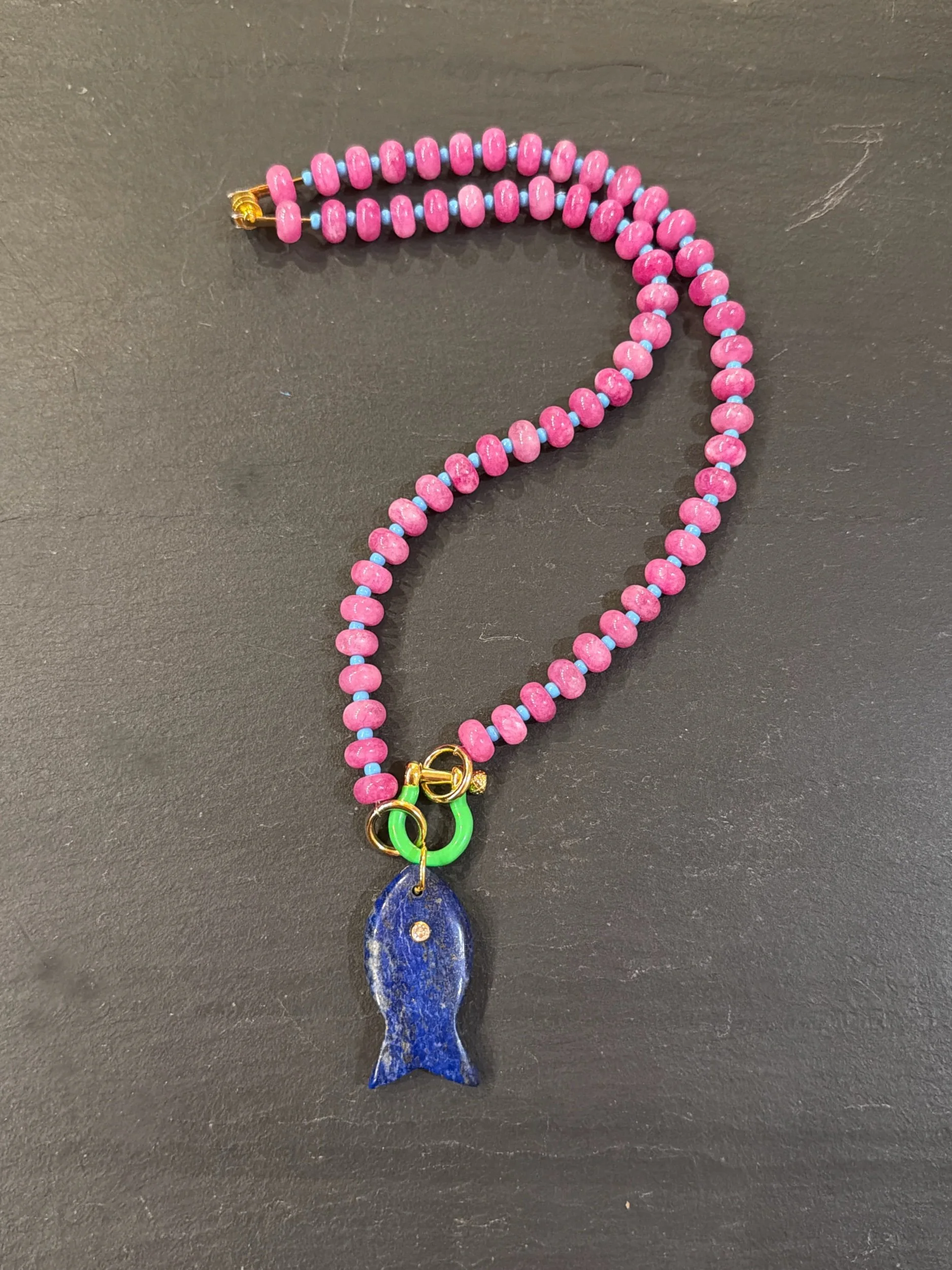 Pink Jade rondelle gemstones with blue glass accent beads finished with a neon green and gold horseshoe and Lapis Lazuli fish pendant. 19” strand length.